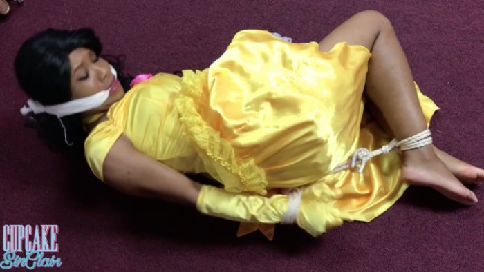 Princess Belle is in dreamland..when suddenly she awakes in damsel land! Princess Belle finds herself in a strict rope bondage hogtie, exposing her dainty bare feet and securely binding her satin glove clad arms. The Princess is indignant and goes to speak - and realizes her mouth is cleave gagged! Princess Belle squirms and struggles against the bondage, demanding to be let out immediately. She wiggles her bare feet, rolls around, and does all she can to escape - angrily muttering to herself and calling out the entire time. After all, you simply cannot treat royalty this way! The princess struggles on her stomach, then rolls onto her back trying to find the perfect position of escape from her hogtie. Finally, exhausted, she goes still, panting. What will happen to her next?